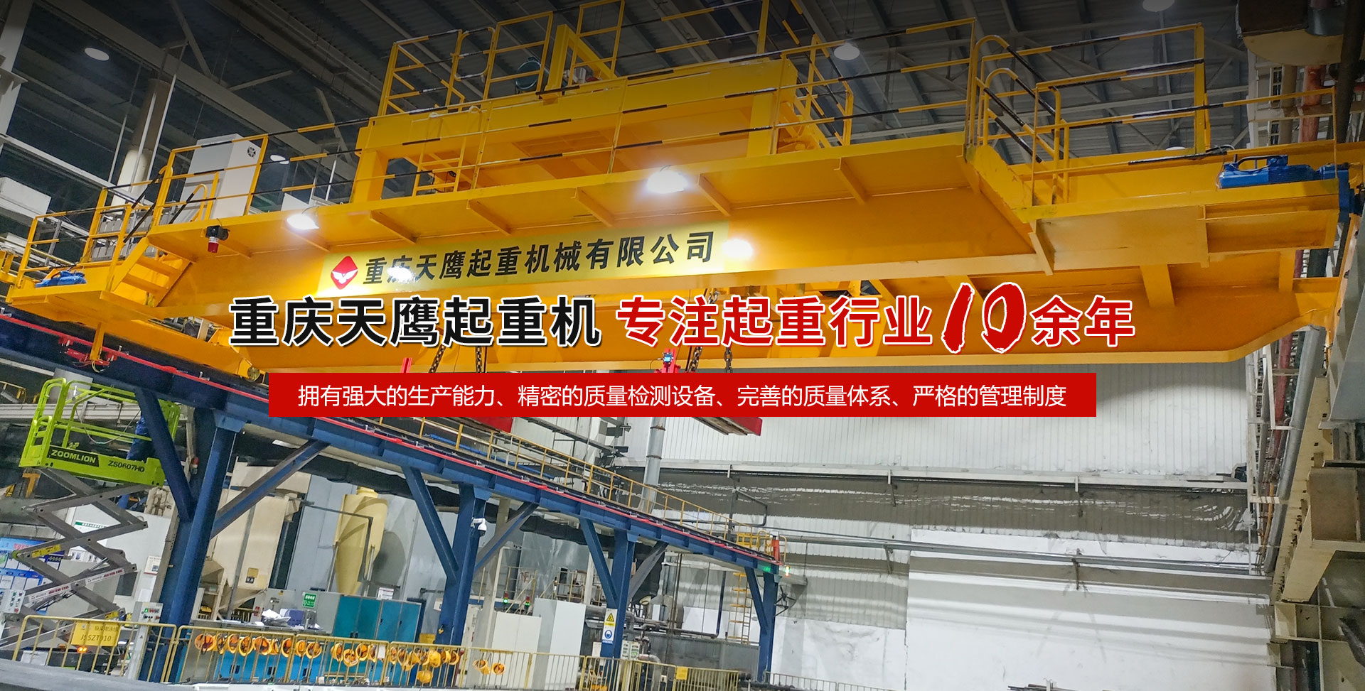 重慶天鷹起重機(jī)械有限公司成立于2014年,主營(yíng)起重機(jī)的銷售、安裝和維護(hù)等相關(guān)服務(wù)。中國(guó)重型機(jī)械工業(yè)協(xié)會(huì)員單位、為中國(guó)工程機(jī)械工業(yè)協(xié)會(huì)工程機(jī)械維修分會(huì)會(huì)員單位及西南地區(qū)起重機(jī)械定點(diǎn)安裝維修單位。具有國(guó)家質(zhì)量監(jiān)督檢疫總局頒發(fā)的特種設(shè)備安裝維修改造質(zhì)格證書(shū)。并率先通過(guò)了IS09001-2000質(zhì)量體系認(rèn)證。 公司注冊(cè)資金3000萬(wàn)元;廠房面積2萬(wàn)平方米;各種生產(chǎn)檢測(cè)設(shè)備50臺(tái)套,公司技術(shù)力量雄厚,聘請(qǐng)了國(guó)內(nèi)知名起重機(jī)專家、工程技術(shù)人員擔(dān)當(dāng)項(xiàng)目經(jīng)理、技術(shù)總工程師及顧問(wèn)。現(xiàn)擁有員工100多人,其中工程技術(shù)人員12人。 主導(dǎo)產(chǎn)品為各類橋、門式起重機(jī)及輕小型起重設(shè)備,具備生產(chǎn)起重量200t及以下通用橋、門式起重機(jī)的能力,尤其在200t以下起重機(jī)產(chǎn)品上具備較強(qiáng)的市場(chǎng)競(jìng)爭(zhēng)力,為許多行業(yè)設(shè)計(jì)制造了技術(shù)含量高、技術(shù)性強(qiáng)的起重設(shè)備,許多產(chǎn)品在原設(shè)計(jì)標(biāo)準(zhǔn)上進(jìn)行了較大的改進(jìn)、優(yōu)化和創(chuàng)新;其中NH型系列電動(dòng)葫蘆、HD型電動(dòng)單梁處于國(guó)內(nèi)高水平..... 好的產(chǎn)品品質(zhì)需要由較高的裝備水平來(lái)保證,公司購(gòu)買了“大型數(shù)控落地鏜”、“數(shù)控切割機(jī)床”、“自調(diào)式焊接滾輪機(jī)”、“數(shù)顯液壓板料折彎?rùn)C(jī)”、“超大型數(shù)控臥式車床”、“數(shù)控液壓水平下調(diào)式三輥卷板機(jī)”、“單柱移動(dòng)式立式車床”“擁有用于單梁生產(chǎn)的全國(guó)一條拋丸噴漆烘干線、葫蘆噴漆烘干線和全國(guó)較大的100T葫蘆試驗(yàn)臺(tái)和檢測(cè)中心”等各種先進(jìn)的加工設(shè)備,新建廠房面積近2萬(wàn)平方米。 質(zhì)量是企業(yè)的生命,天鷹公司依據(jù)“ISO 9001國(guó)際質(zhì)量管理體系”標(biāo)準(zhǔn),制定并完善了公司的質(zhì)量管理體制。堅(jiān)持質(zhì)量體系的內(nèi)審和外審,將質(zhì)量管理工作落實(shí)到企業(yè)生產(chǎn)經(jīng)營(yíng)的全過(guò)程。 您的微笑,是天鷹永恒的追求;天鷹的服務(wù),是您首要的選擇!因?yàn)槲覀儓?jiān)信:“誠(chéng)信是本、質(zhì)量鑄就品牌”。為您服務(wù)是我們的榮耀,勤奮而進(jìn)取的天鷹人,時(shí)刻期盼著您的到來(lái)。